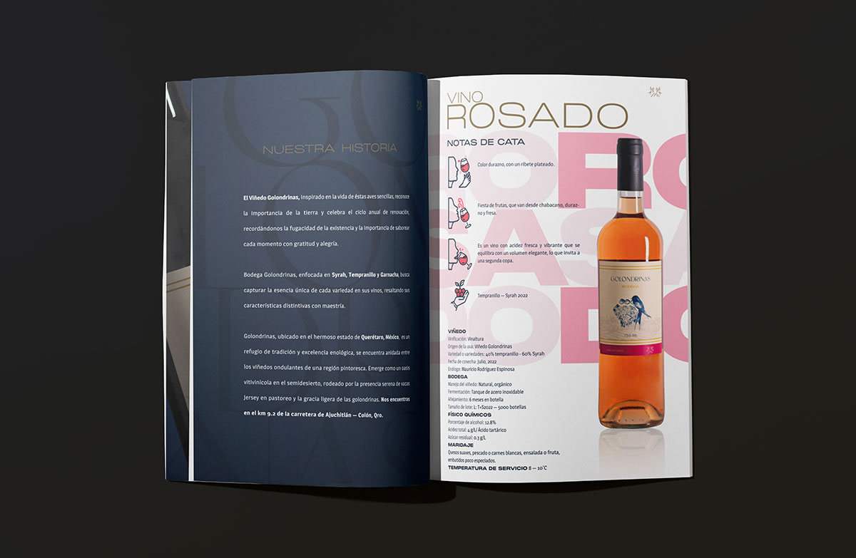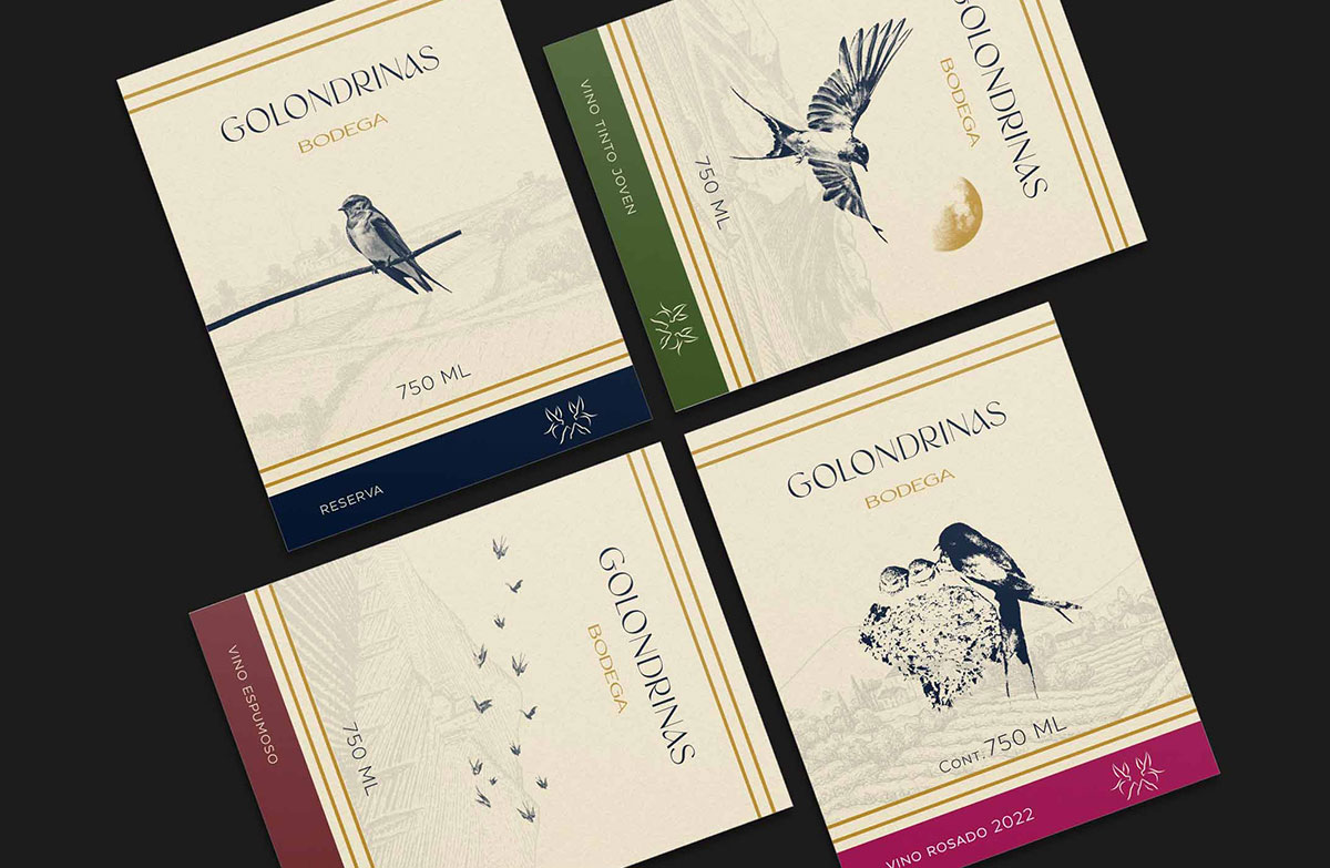 Label Design for Golondrinas Wine (Querétaro, Mexico). Inspired by the cyclical and earth-bound life of the swallow (golondrina), the design for the Reserva, Joven, Rosado, and Espumoso varieties celebrates renewal and invites us to savor the present with gratitude.